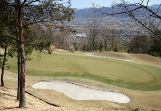 ロングホール。右側は広いので山すそを狙っていけば2オンもできるでしょう。左へ打つと隣ホールで打ち上げになるので注意が必要です。グリーン手前のバンカーに入れないようにしましょう。